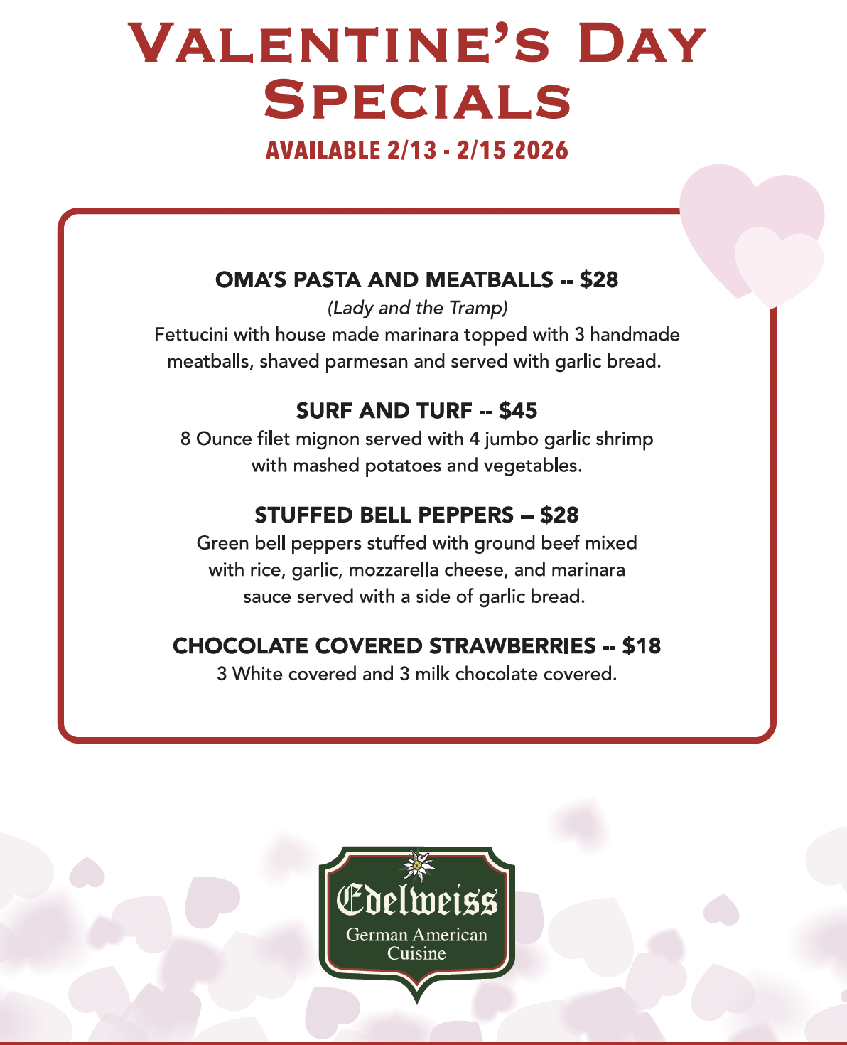 Edelweiss is here to satisfy all your Lenten cravings. Menu highlights include our Hand Beer Battered Fresh Cod, potato and cheese pierogies, Cheesy spätzle, and your favorite German appetizers!